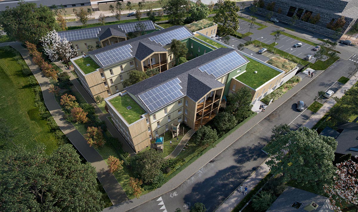 Projet bas carbone avec des matériaux biosourcés et bioclimatique de haute performance avec mise en place d’équipements d’énergie renouvelables : panneaux photovoltaïque, pompes à chaleur (PAC) sur sondes géothermiques, récupération des eaux pluviales,
